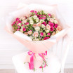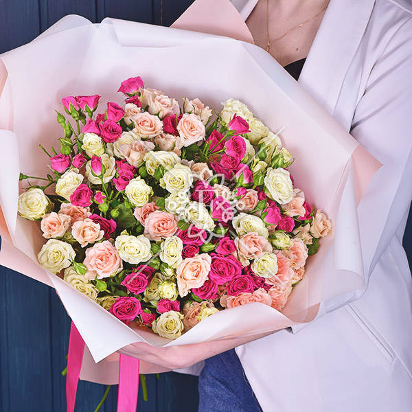 Букет из кустовых роз насыщенно-розового, персикового и ванильно-белого оттенка выглядит восхитительно! Эта цветочная композиция будет принята с большой радостью!